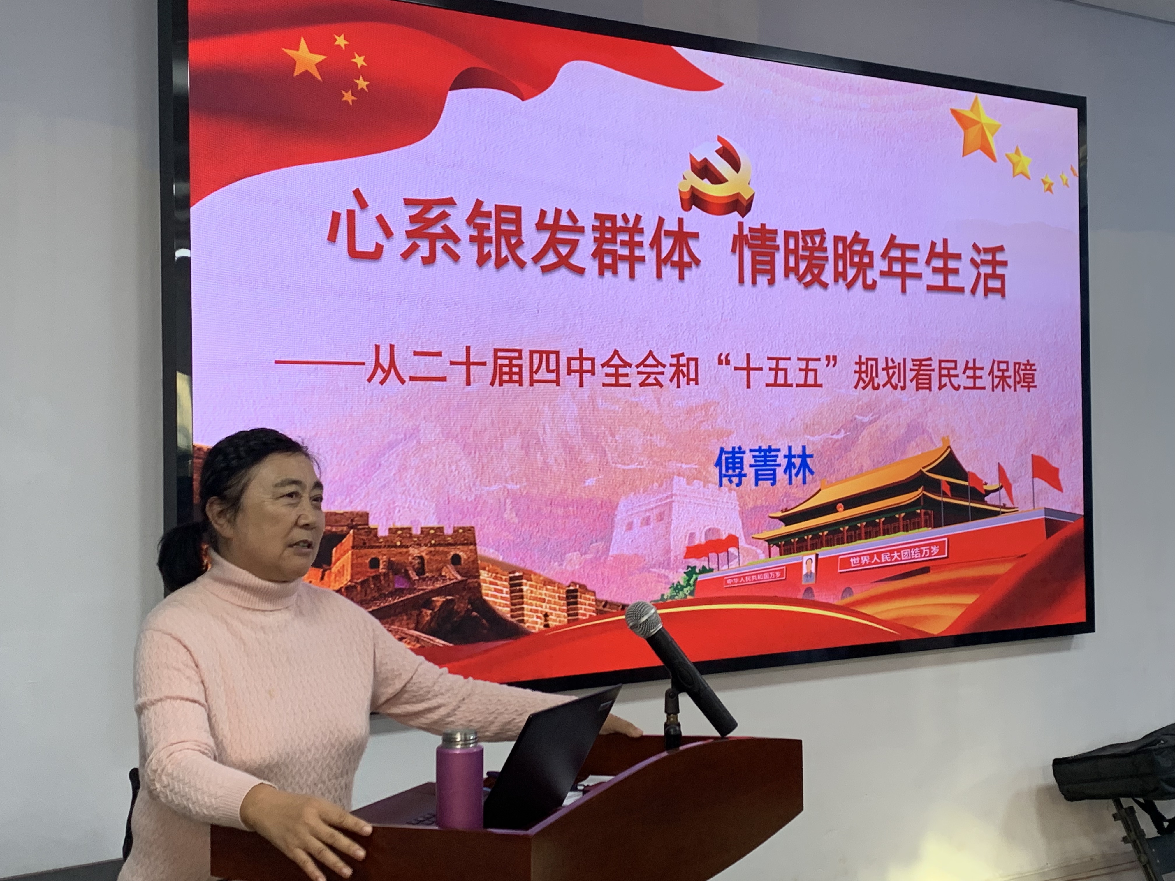 报告会上,傅菁林教授以“心系银发群体,情暖晚年生活——从党的二十届四中全会和‘十五五’规划看民生保障”为题,围绕全会领航,读懂新时代民生发展的“新坐标”、福祉护航,细数晚年生活的“新保障”和银发聚力,共赴新时代的“新征程”三大核心维度展开宣讲。她以通俗易懂的语言解读了党的二十届四中全会关于完善民生保障体系的核心要义,结合“十五五”规划对养老服务、健康保障等领域的战略部署,深刻阐释了新时代民生发展的新方向、新要求,让老同志们精准把握政策导向,明晰晚年生活的保障蓝图。傅菁林教授结合鲜活案例,从养老服务供给、医疗保障优化、精神文化滋养等方面,细致梳理了近年来国家及学校在离退休工作中的惠民举措。他用详实的数据、生动的事例,让老同志们真切感受到党和国家对银发群体的关怀,以及学校离退工作的扎实成效,增强了老同志们的获得感、幸福感和安全感。最后,傅菁林教授鼓励老同志们发挥政治优势、经验优势和威望优势,继续为学校发展、社会建设建言献策,在新时代的征程中展现银发担当、贡献银发力量。
